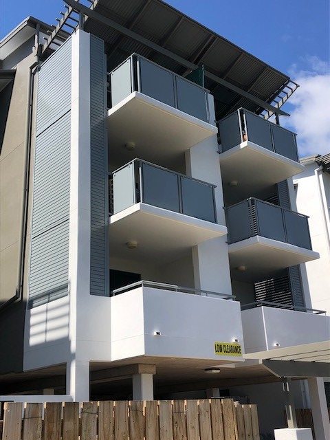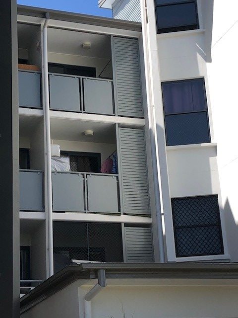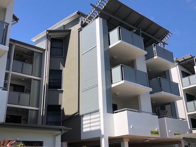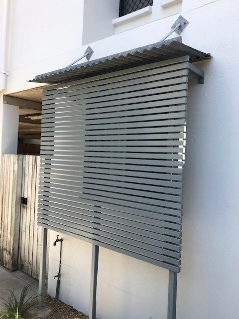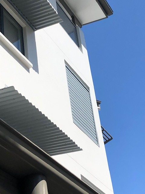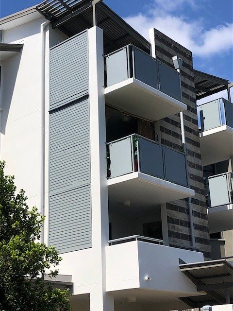 Aluminium louvered slat screens creating shade and privacy matching the structures aesthetics.