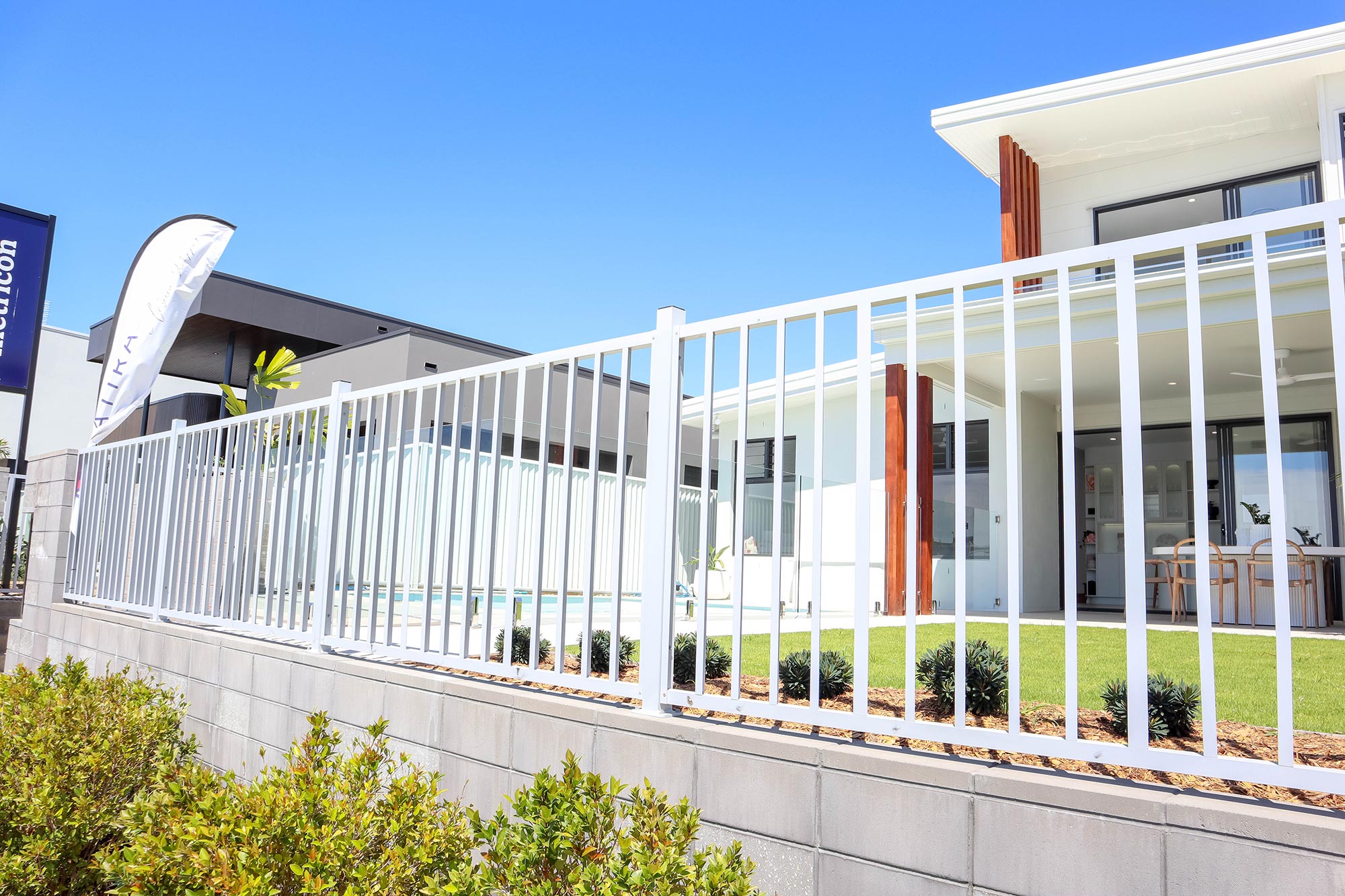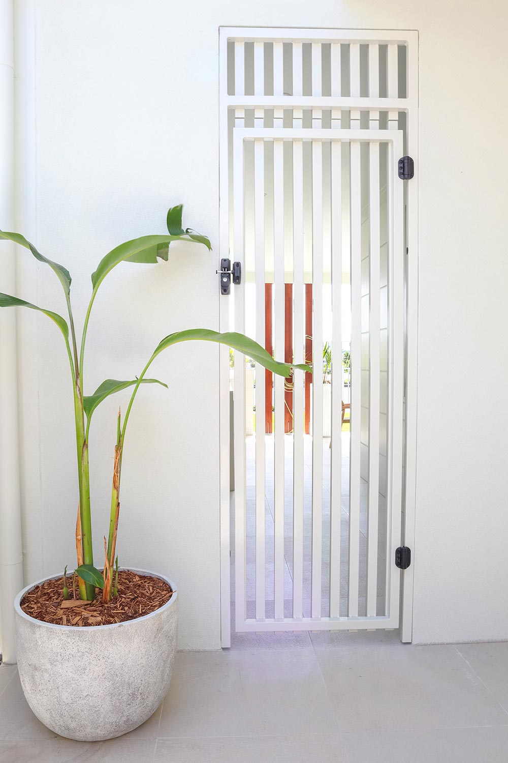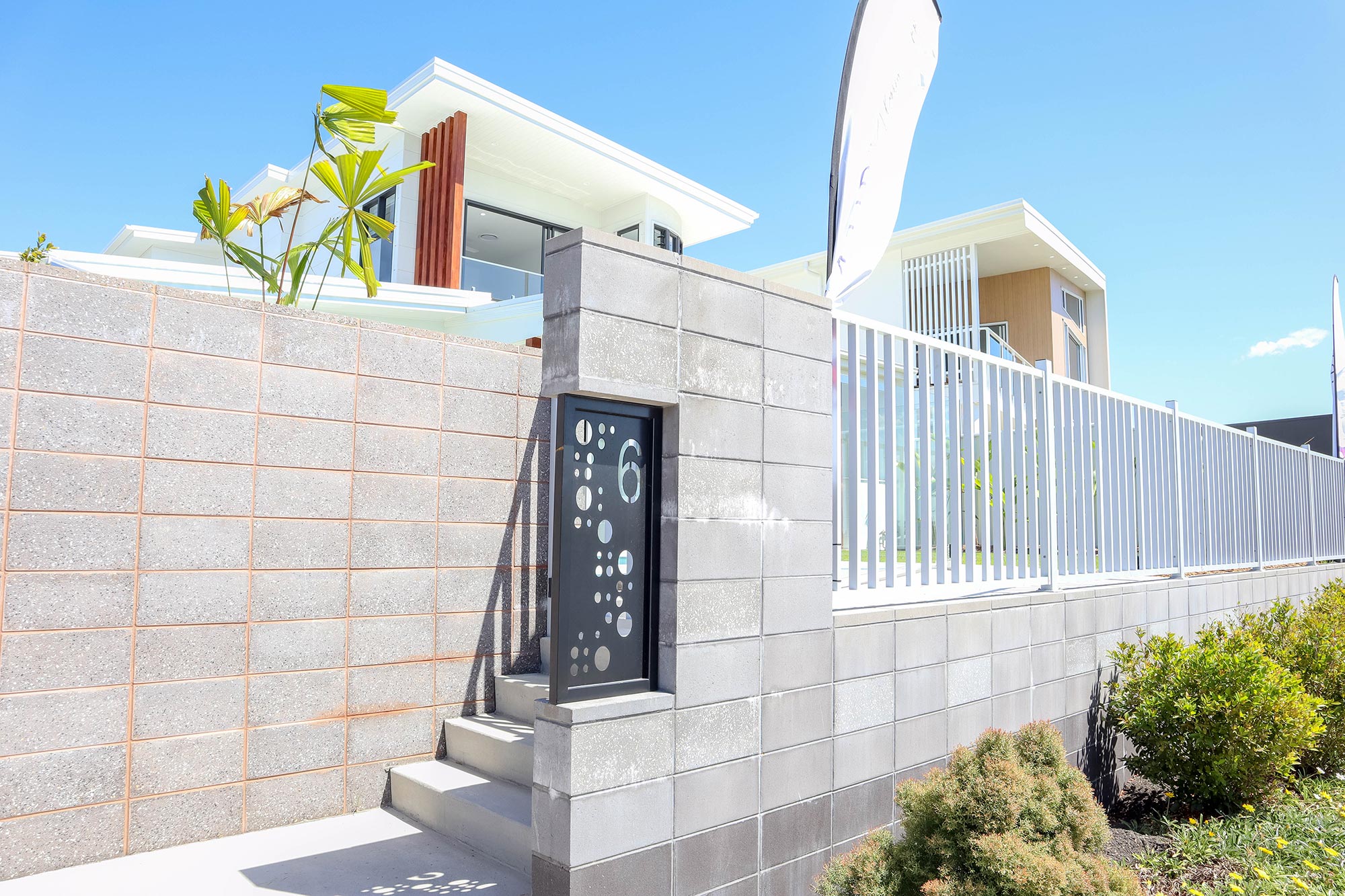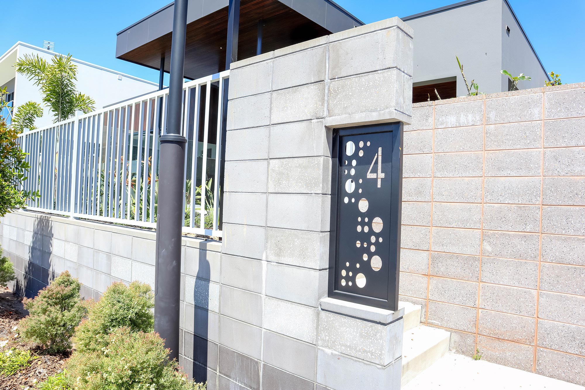 The client required a seamless screen to fit the aesthetic of the project but provide necessary security from the road to the entrance. We produced an aluminium custom-made seat at the entrance to fill white space, feature side gates with hardware, and an entrance feature wall cut-down on site to give an extra feature to add curves to straight line affects.