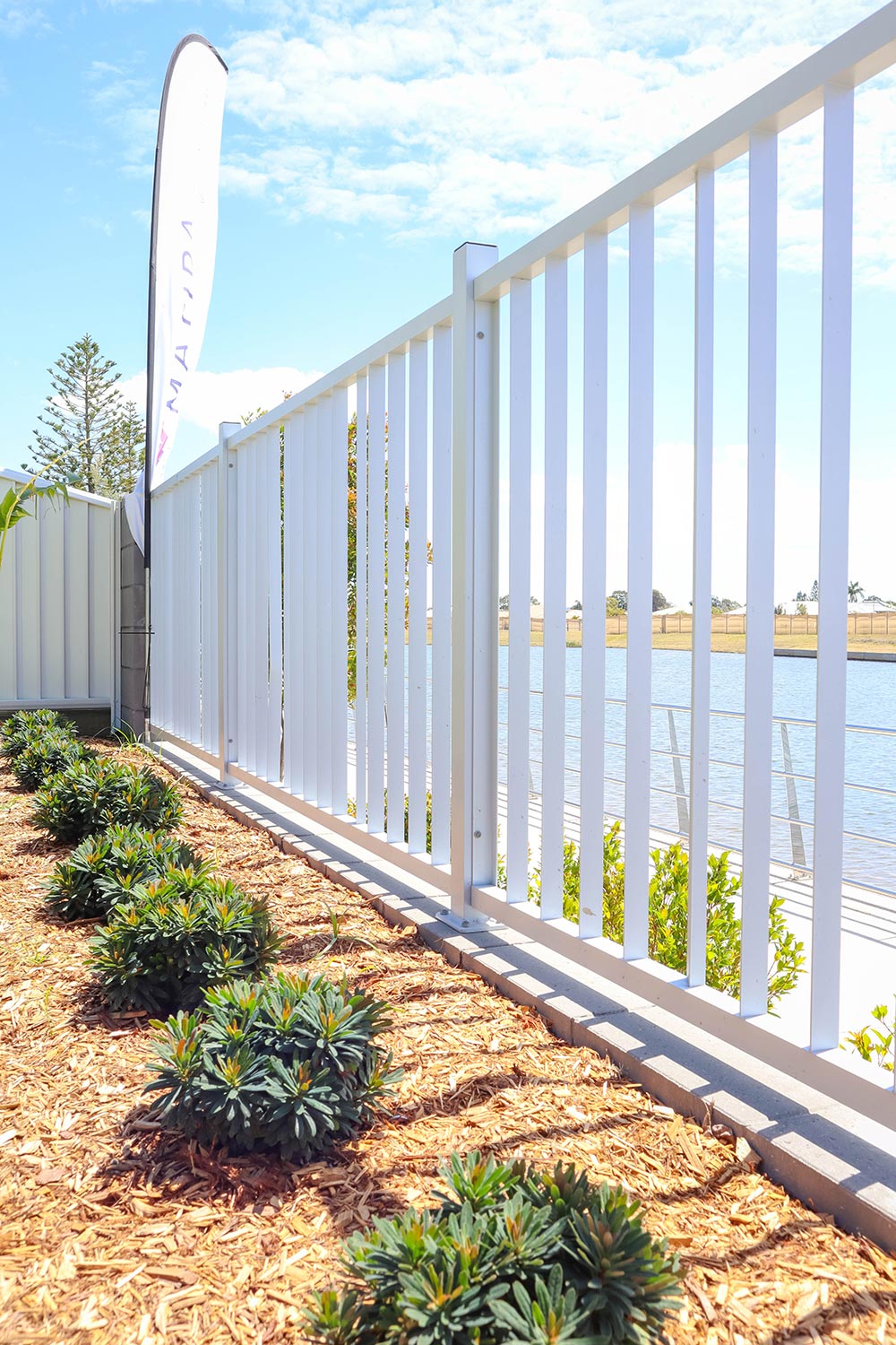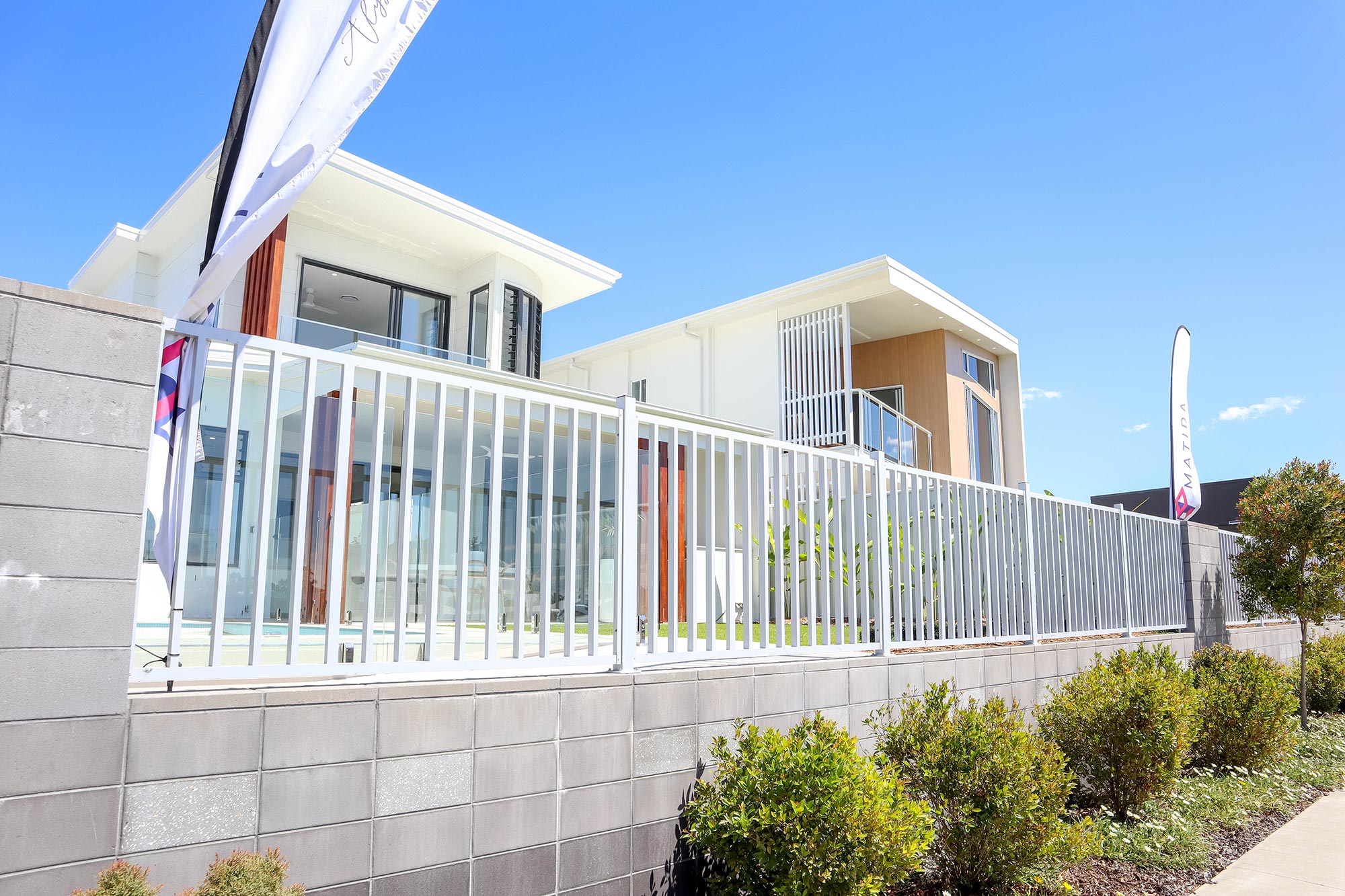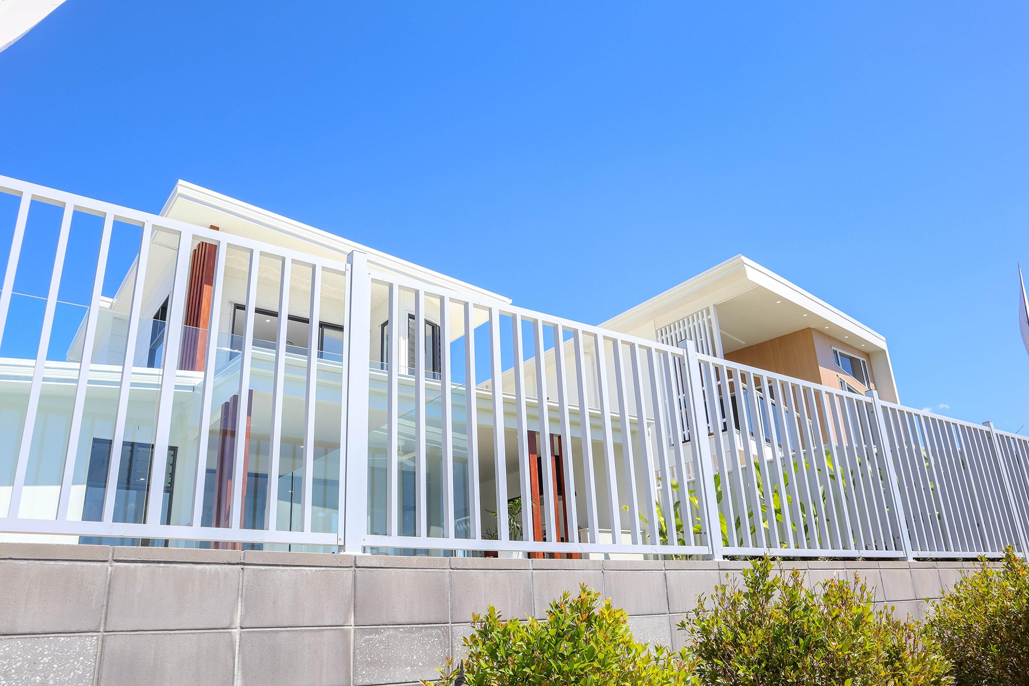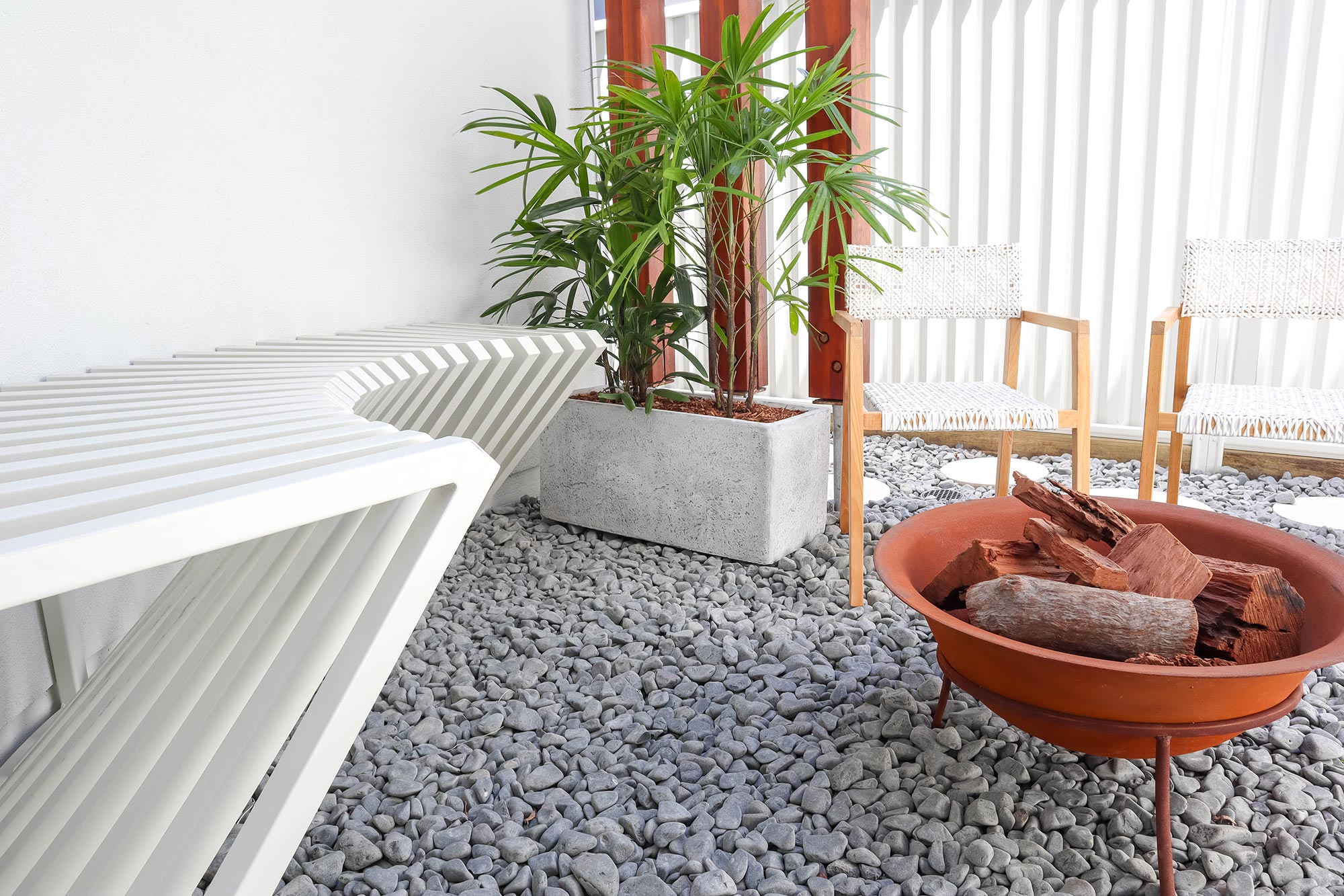 The client required a seamless screen to fit the aesthetic of the project but provide necessary security from the road to the entrance. We produced an aluminium custom-made seat at the entrance to fill white space, feature side gates with hardware, and an entrance feature wall cut-down on site to give an extra feature to add curves to straight line affects.